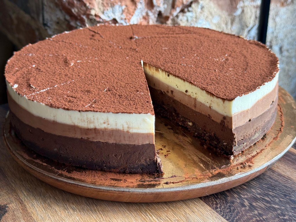 Cheesecake Triple čoko samozřejmě plný čokolády od bílé až po černou, mascarpone, smetana a Philadelphie, sušenky, kakao a máslo.